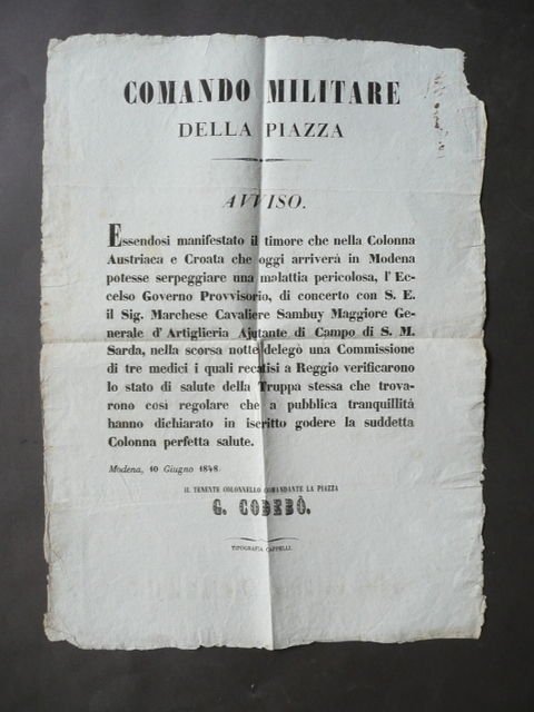 Avviso Comando Militare Colonna Austriaco Croata Malattia Sambuy Modena 1848