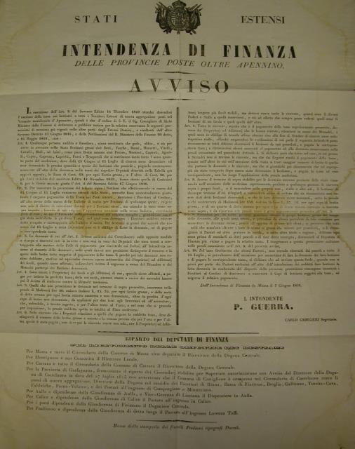 Editto originale in formato cm.61x46,3, promulgato in data 7 giugno 1851 dall'Intendente P.Guerra a firma del Segretario Carlo Giorgieri. Stemma estense impresso al centro in alto. il provvedimento si riferisce ai Riparti dei Deputati di Finanza di Massa, Montignoso, Carrara, Garfagnana, Aulla e Licciana, Calice, Fivizzano, Fosdinovo. Codice libreria 109889.