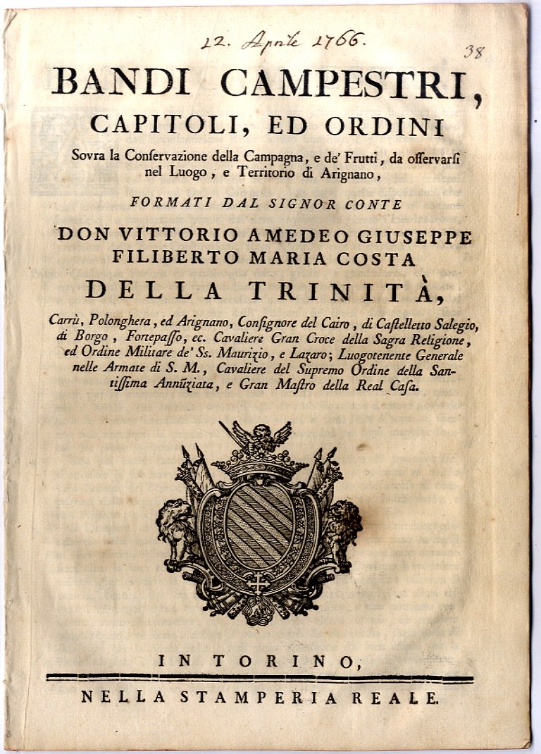 Bandi campestri, capitoli e ordini sopra la conservazione della campagna...e territorio di Arignano