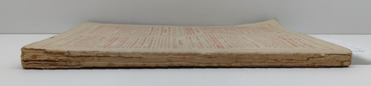 In precarie condizioni, legatura morbida editoriale con aloni e fioriture ai piatti e al dorso, firma di possesso al margine superiore del piatto anteriore, dorso con abrasioni e strappi riparati, tagli irregolari bruniti con fioriture e mancanze, legatura leggermente allentata, firma di possesso alla frontespizio, uno strappo di centimetri 4,5 al margine inferiore tra piatto anteriore e dorso, lieve brunitura al margine interno delle pagine, sottolineature diffuse alle pagine con matita viola, vedere immagini, a pagina 67 uno strappo al margine inferiore interno di cm 3 numero pagine 177 dimensioni cm 24 * 17,2