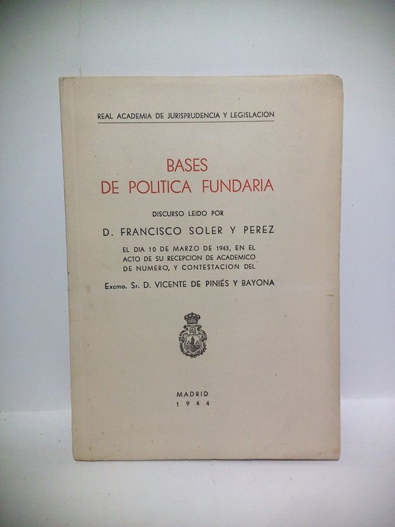 Bases de política fundaria. (Disc. de ingreso en la R. A. de Jurispr. y Legislación. CONTESTA: Vicente Piniés)