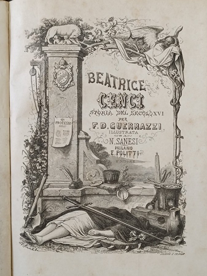 In-8° (cm. 22,6), solida legatura coeva in mezza pelle, dorso liscio con titolo in oro su tassello nero e fregi sempre in oro (lievi tracce d'uso), piatti e tagli marmorizzati; pp. XLIV 680 in stato molto buono (lievi fioriture sparse, rinforzo all'ultima carta e all'antiporta); con 42 tavole in rame nel testo, di cui 1 ritratto all'antiporta e 1 frontespizio interamente figurato ed inciso. Prima edizione illustrata con numerose incisioni di Nicola Sanesi, tra cui i graziosissimi capilettera. Celebre romanzo del Guerrazzi dedicato al parricidio Cenci e alla tragedia di Beatrice, tanto amata in epoca romantica da ispirare, oltre al Guerrazzi, Shelley, Dumas e Stendhal. Esemplare molto buono. (NF2)