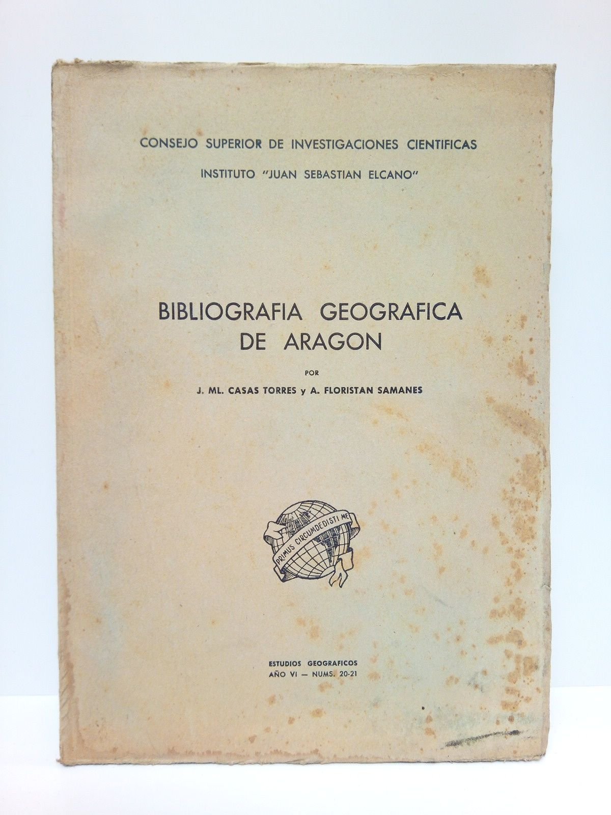 Madrid [pero imp. en Zaragoza]: CSIC - Inst. Juan Sebastián Elcano, [ca. 1945].- P. 557-726 (en total 170 pags.); 4º (24,3 x 17,5 cm); Cartulina Ed.- (Separata de Estudios Geográficos. Año VI - Nos. 20-21).* Cubierta anterior algo manchada de óxido. La cara anterior de la portadilla y la posterior de la última hoja en blanco, se encuentran oscurecidas por su contacto con la cartulina de la cubierta que es de composición muy ácida. BIBLIOGRAFÍA Y DOCUMENTACIÓN ESPAÑOLAS