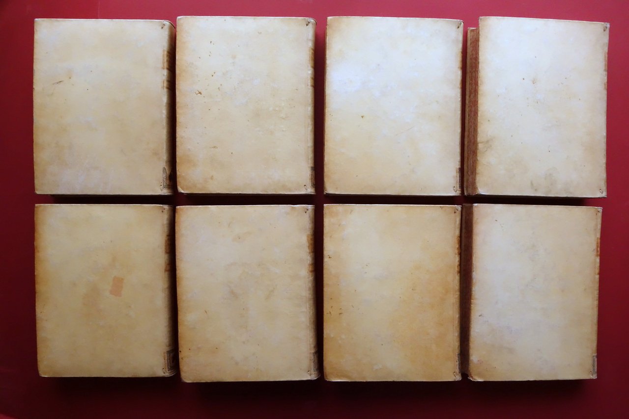 Settecentina (8 volumi), Bibliotheca Canonica, Juridica, Moralis, Theologica nec non ascetica, polemica, rubricistica, historica, ecc. [.] ac in otto tomos distribuita ab Lucio Ferraris [.] editio prima romana - opera completa in otto volumi 8 voll.; Apud Haeredes Joannis Laurentii Barbiellini in Foro Pasquini, Romae 1756-62; cm 28x21; pp. XXVIII-426 (vol. I); pp. VI-508 (vol. II); pp. VI-466 (vol. III); pp. VIII-520 (vol. IV); pp. IV-412 (vol. V); pp. 570 (vol. VI); pp. VI-556 (vol. VII); pp. VIII-190-[2]-320 (vol. VIII) ; tutti con alcuni bei capilettera e fregi xilografici; bellissima legatura d'epoca in piena pergamena con titoli impressi in oro al dorso, tagli colorati a spruzzo. Alla cuffia inferiore di ciascun volume applicata etichetta numerica. Opera completa in otto volumi. Condizioni di conservazione Volumi tutti in buone condizioni con tracce d'uso e segni del tempo, coperte con alcuni lievi / leggeri aloni e macchiette; angoli dei piatti con minime mancanze al rivesimento in pergamena; qualche etichetta alle cuffie con piccole marginali mancanze. Interni buoni con leggero foxing; qualche pagina con normali minimi accenni di ingiallimento dovuti all'età. Pagine 447-448 del volume II con una piccola mancanza all'angolo inferiore che non interessa il testo. Pp. 455-456 del volume IV con un paio di minuscole mancanze che non impediscono la comprensione del testo. Angolo inferiore di numerose pagine dei volumi VI e VII con una circoscritta leggera ombra di gora che non interessa il testo. Volume VIII mancante del risguardo posteriore. Seconda di copertina di ciascun volume con circoscritta abrasione o traccia di precedente elemento applicato. Rara prima edizione romana, completa in otto volumi. Bell'esemplare, marginoso e dalla pregevole legatura d'epoca in piena pergamena. Tagli colorati a spruzzo. SETT243.L26829 N