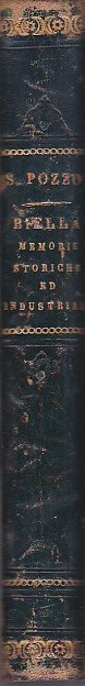 In-8° (210x140mm), pp. (4), III, 404, legatura coeva m. pelle verde cupo con titolo in oro e ornamenti in oro e a secco al dorso. Piatti marmorizzati. Sguardie verdi. Uno stemma di Biella inciso a p. pag. Un timbro del tempo di privato possesso. Qualche lieve sottolineatura a matita. Bell'esemplare. Prima edizione, rara. Memorie di storia civile ed ecclesiastica biellese. Alle pp. 213-238, elenco degli opifici industriali descritti e suddivisi per vallata. Manno, III, 12263.