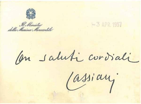 Biglietto da visita intestato: " Il Ministro della Marina Mercantile" datato: "3 apr. 1957"