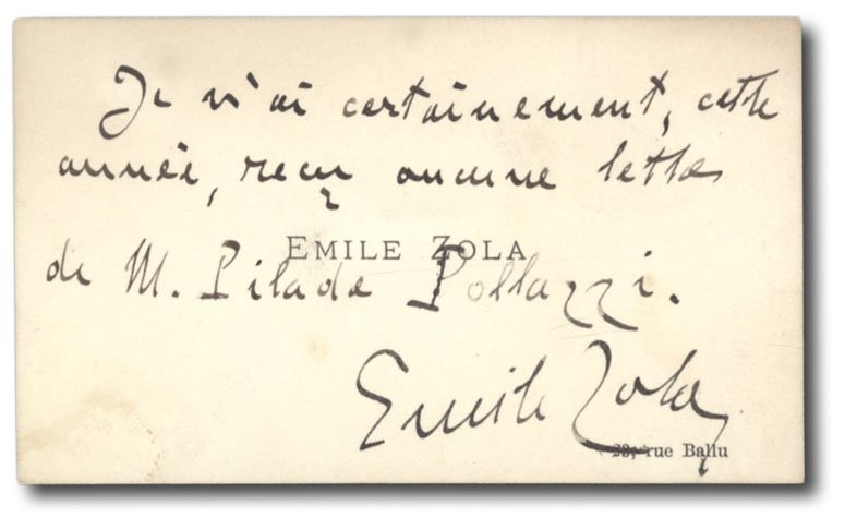 >biglietto da visita: Emile Zola, 23 rue Ballu.Il 23 di Rue Ballu si trova nel quartiere «Nouvelle Athènes», immobile simbolo dell'Art Nouveau. Vi abitarono Emile Zola e Edgar Degas, ed è conosciuto per la celebre quartina di Stéphane Mallarmé : « Rue, au 23, Ballu/J'exprime à Monsieur Degas/La satisfaction qu'il rime/Avec la fleur des syringas». Il testo del biglietto fa riferimento a Pilade Pollazzi (Firenze, 1852-1940):"Je n'ai certainement, cette année, reçu aucune lettre de M. Pilade Pollazzi.'' Fondatore nel 1885 della rivista 'Scena illustrata', ne fu editore per cinquant'anni. La rivista ebbe successo sia per la scelta collaborazione letteraria (Carducci, De Amicis, Verga, Fogazzaro, Capuana, Croce, Zola) sia per i frontespizi ornati di fregi liberty.