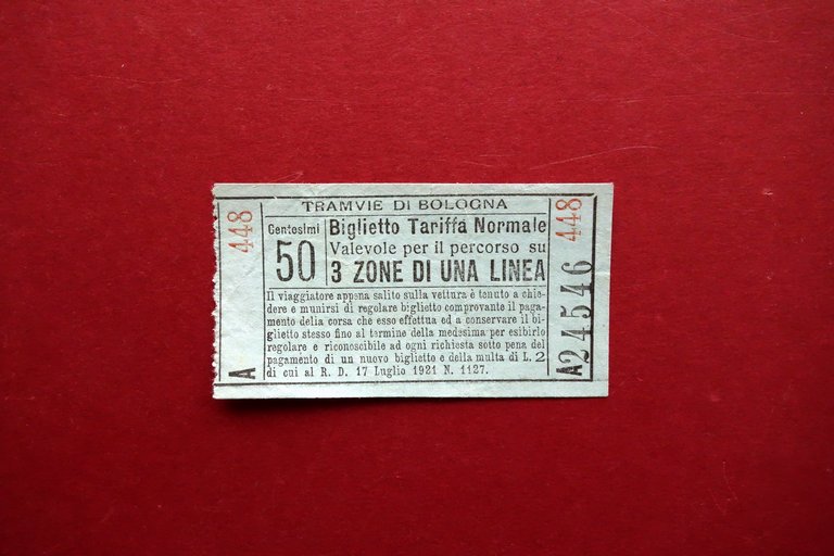 Biglietto del tram, Biglietto del tram tramvie di Bologna tariffa normale - 3 zone di una linea Prem. Stab. Marco Spada & C., Milano, s. d. ma primi del Novecento circa; biglietto del tram a stampa su carta, margine sinistro con tratteggio per distacco singolo. Cm 4x7. Condizioni di conservazione Complessivamente molto ben conservato con minimi segni del tempo. Per ulteriori dettagli vedi foto. SC03.D19311 N