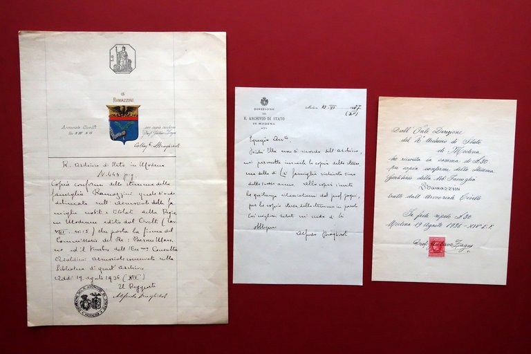 Copia conforme con riproduzione a mano a colori di blasone araldico, Famiglia Ramazzini - Modena copia conforme su carta filigranata del blasone - stemma araldico della famiglia finemente riprodotto a colori ricavato dall'armoriale Civelli (tav. VIII, N. 15) realizzato dal Prof. Gustavo Zagni con timbri e ricevute per avvenuto pagamento della copia 1936 1936; copia conforme di blasone della Famiglia Ramazzini di Modena, finemente riprodotto a colori su bifolio in carta; il blasone è tratto dall'Armoriale Civelli (tav. VIII - N. 15) e fu realizzato dal Prof. Gustavo Zagni. A seguito del blasone descrizione della copia, con timbri per avvenuto suo rilascio e pagamento. Accluse una lettera di accompagnamento dell'allora reggente dell'Archivio alla famiglia Ramazzini, e la ricevuta del pagamento, vidimata e con marca da bollo, per la realizzazione della copia (vedi foto). Cm 30,5x21 (copia conforme); cm 19,5x14 (ricevuta di pagamento); cm 21x14 (lettera di accompagnamento). Condizioni di conservazione Insieme in buone condizioni con minimi segni del tempo, lievi marginali accenni di ingiallimento, leggere normali tracce di pieghe per conservazione o spedizione. Per ulteriori dettagli vedi foto. Bell'insieme. Copia conforme finemente realizzata a mano su carta filigranata. SC03.D18759 N