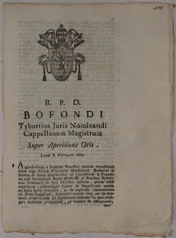 BOFONDI TYBURTINA JURIS NOMINANDI CAPELLANUM MAGISTRUM SUPER APERITIONE ORIS LUNOE 8 FEBRUARII 1830