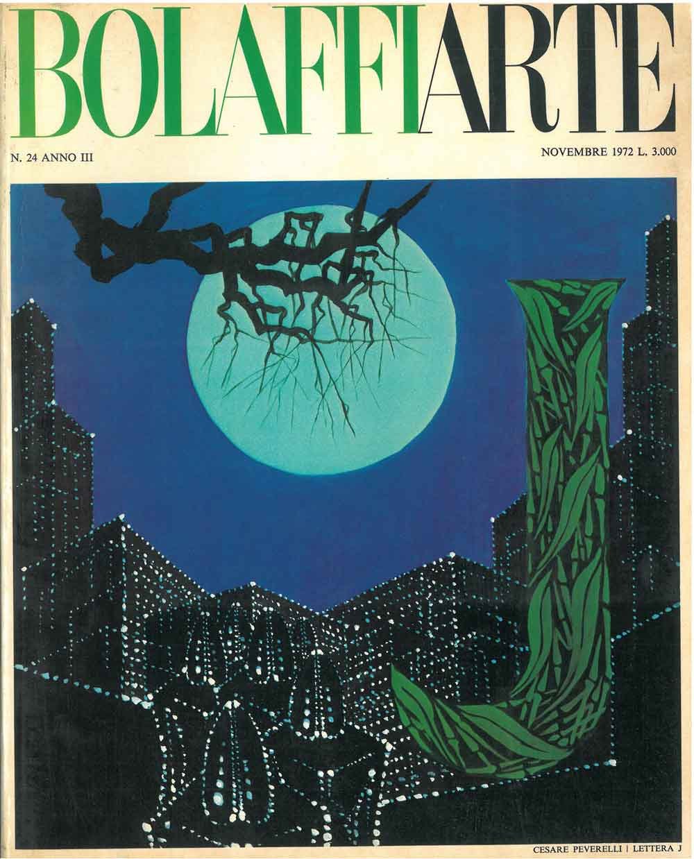 Bolaffiarte. Rivista mensile di informazioni. Anno III, n. 24, novembre 1972. Direttore Umberto Allemandi. Due riproduzioni fotolitografiche: "La lettera J", 5 colori offset, di Cesare Peverelli e "Omaggio a Martiros Sarian, pittore", 5 colori offset, d