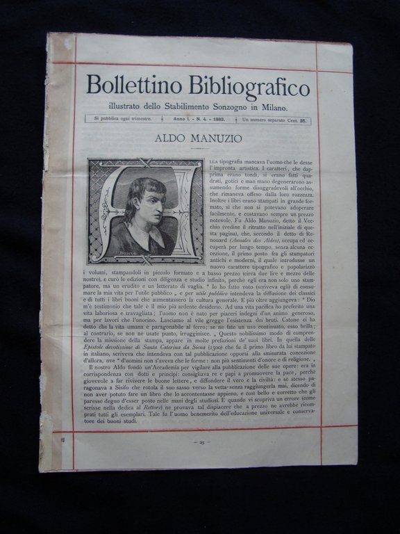 Bollettino bibliografico Sonzogno Milano Anno I N 4 1883 Aldo Manunzio