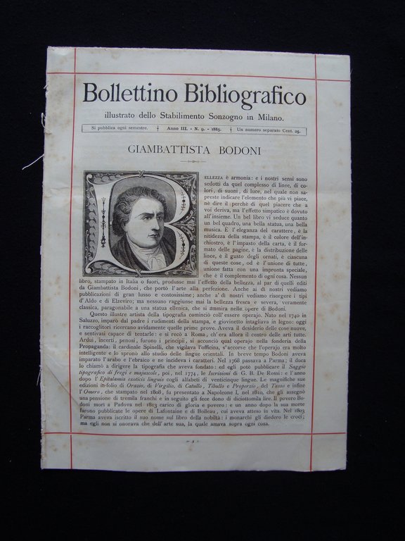 Bollettino bibliografico Sonzogno Milano Anno III N 9 1885 Giambattista Bodoni