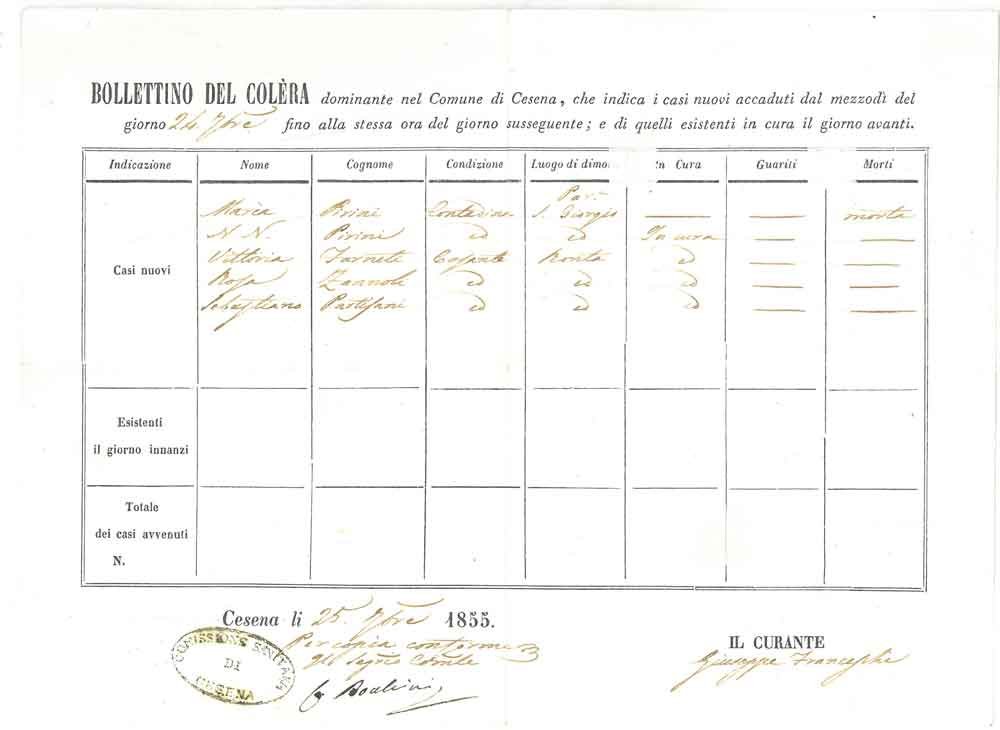 Bollettino del colera dominante nel comune di Cesena che indica i casi nuovi accaduti dal mezzodì del giorno 24 ottobre fino alla stessa ora del giorno susseguente; e di quelli esistenti in cura il giorno avanti