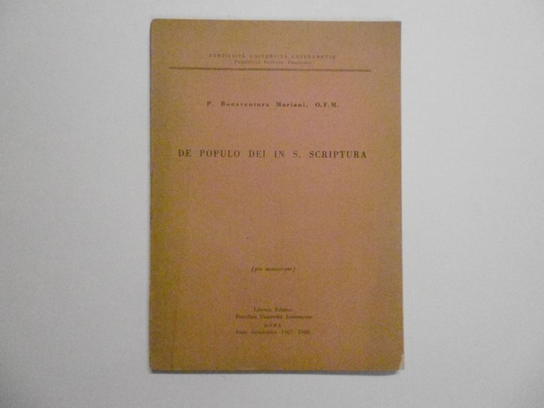 P. Bonaventura Mariani O. F. M., De Populo Dei In S. Scriptura (pro manuscripto) Pontificia Università Lateranense, Roma, 1968, cm 23x16,5; pp. 141. Cartoncino edit. marrone. Condizioni di conservazione Esemplare in buone condizioni di conservazione. Una piccola mancanza all'angolo inf. destro del fronte della coperta. Un taglio tra il fronte della coperta e il dorso. Alcune bruniture alla coperta. In qualche pag. alcune parole sottolineate ed annotazioni a penna. Un timbro dell'ex biblioteca regolarmente annullato alla prima bianca. SETT82.L22517G