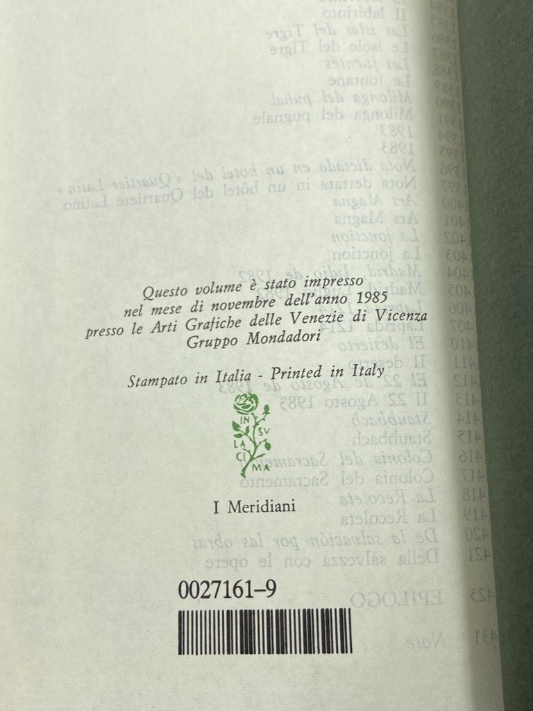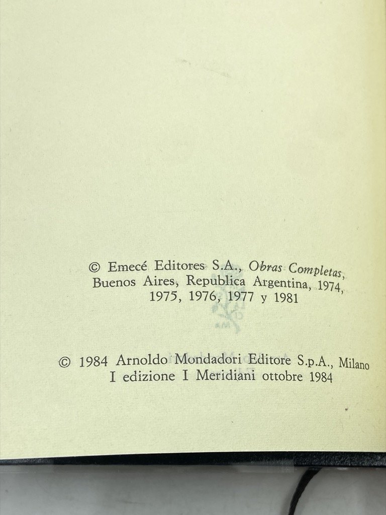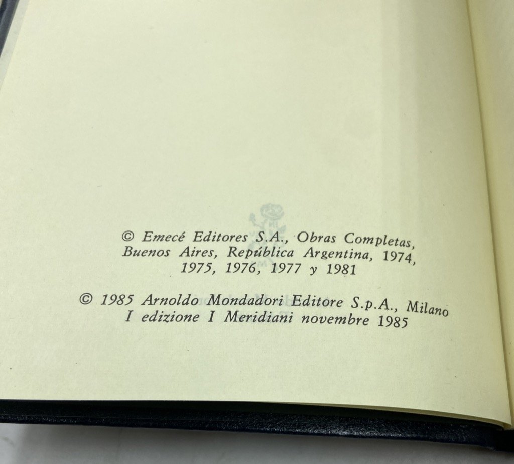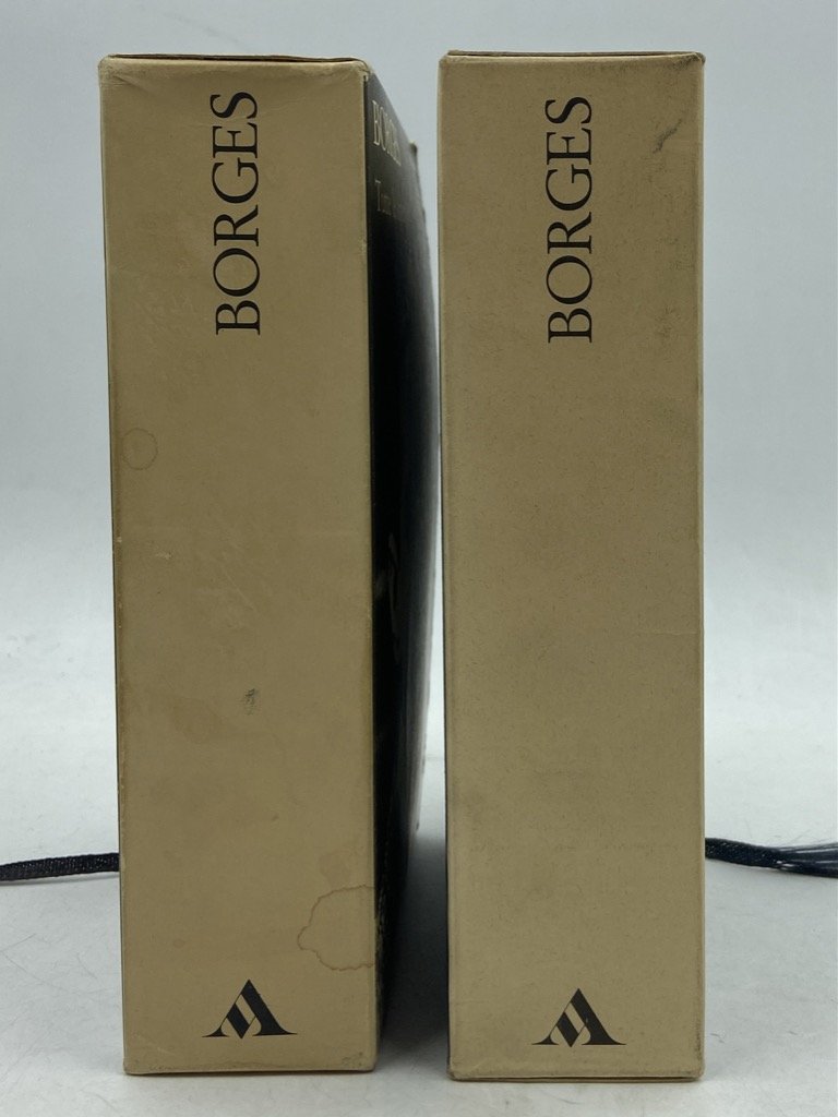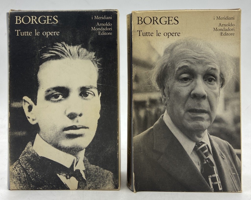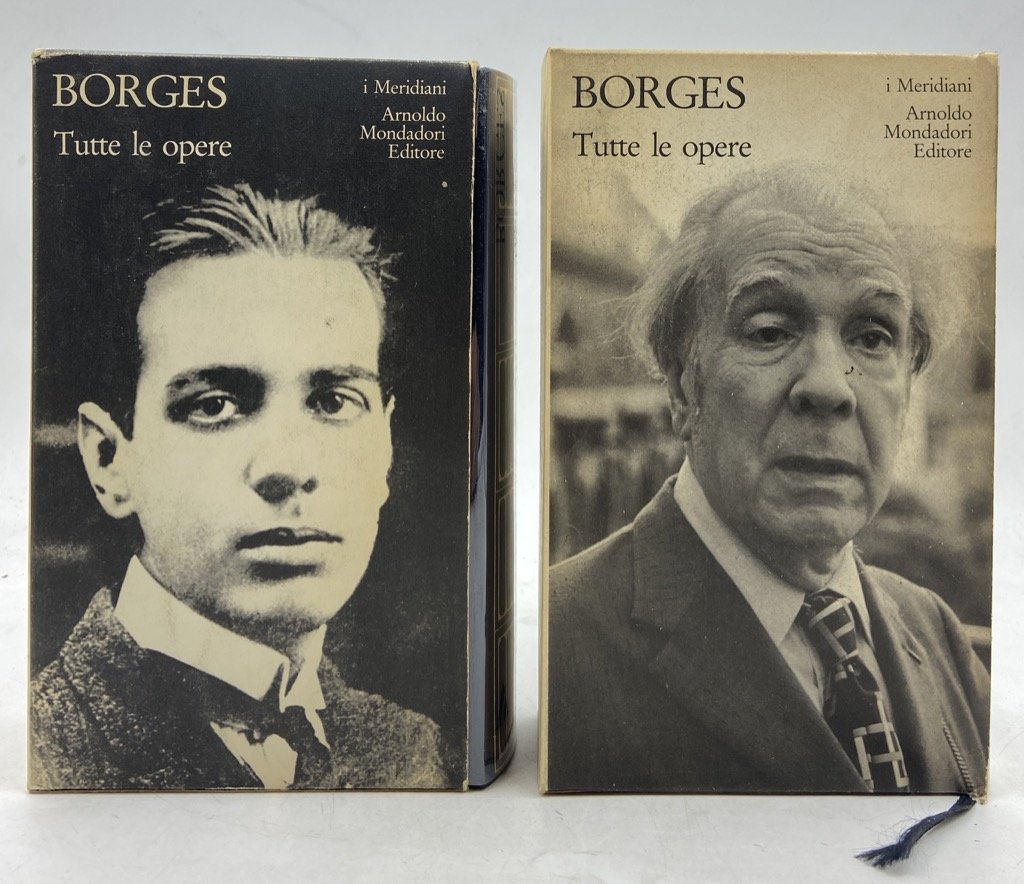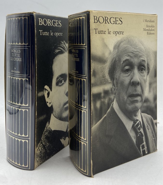 Due volumi, legatura editoriale in pelle blu con titoli dorati sul dorso, acetato trasparente e custodia in cartoncino illustrata, cm 17.5 x 10.5, pp CXX (2) 1301 (1), XXXI (1) 1471 (1). Collana I Meridiani. Prima edizione. Pecetta del prezzo rimossa, lievi segni d'uso e macchiette sui cofanetti ma internamente molto ben conservati. I due Meridiani dedicati al grande scrittore argentino, apparsi poco prima della sua scomparsa, entrambi in prima edizione. La raccolta, curata da Domenico Porzio, comprende una lunga introduzione critica con cronologia, e le opere in prosa e versi di Borges: Fervore di Buenos Aires, Luna di Fronte, Quaderno San Martin, Evaristo Carriego, Discussione, Storia universale dell'infamia, Storia dell'eternità, Finzioni, L'Alpeh, Altre inquisizioni, L'artefice, L'altro lo stesso, Per le sei corde, Elogio dell'ombra, Il manoscritto Brodie, L'oro delle tigri, Il libro di sabbia, La Rosa profonda, Prologhi, La moneta di ferro, Storia della notte, Tigri azzurre, La cifra, Saggi danteschi, Atlante, Epilogo. Le opere in versi sono presentate con testo a fronte. Il cofanetto del secondo volume è illustrato con un ritratto di Borges fotografato da Mario de Biasi.
