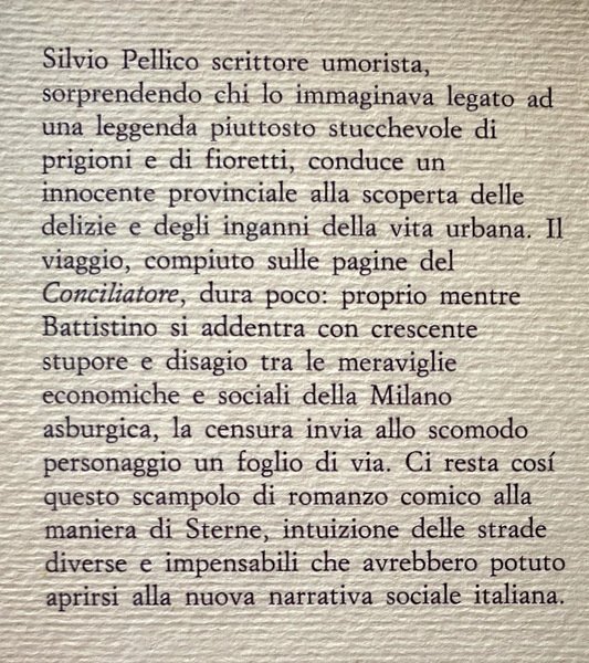 fu soppresso dalla censura austriaca dopo la terza puntata. In appendice antologia di testi di Pellico, soprattutto legati al Battistino, apparsi sulla stessa rivista.