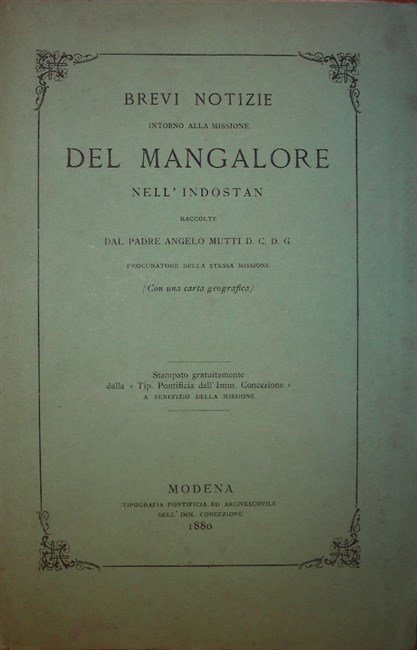 in-8 gr., pp. 56, 1, bross. edit. Con una gr. tav. litogr. ripiegata al fine raff. il vicariato apostolico di Mangalore nelle Indie orientali (Canarà e Malabar). Descrizione della regione, il sultanato di Tippù, la storia della fondazione della missione e del Collegio di San Luigi Gonzaga, rapporti tra i gruppi religiosi. Perfetto esempl. [168]