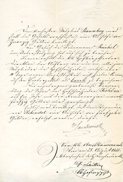 2 SS. auf Doppelblatt. Folio. Mit Adresse (Faltbrief). An die k. k. Hofburgtheater-Direktion, d. i. Heinrich Laube, in Sachen des Schauspielers Bernhard Baumgartner und mit der Bewilligung, "daß der von ihm ausgestellte Wechsel [.] Siebenhundertfünfzig Gulden [.] durch die Hoftheaterkassa bezahlt und eingelöst werden dürfe [.]". - Einer alten französischen, später nach Polen ausgewanderten Familie entstammend, wurde Karl Gf. Lanckoronski-Brzezie "der Nachfolger des Grafen Moriz Dietrichstein in der Würde des Oberstkämmerers, unter dessen Obhut die Schatzkammer, die naturwissenschaftlichen Cabinete (das zoologische, botanische, mineralogische und das physikalisch-astronomische), das Münz- und Antikencabinet, die Ambraser Sammlung, die Gemälde-Gallerie und die beiden Hoftheater, das Hofburg- und Hofoperntheater, gestellt sind" (Wurzbach XIV, s. v.). - Auf Briefpapier mit gepr. Briefkopf des K. K. Oberstkämmerer-Amts und papiergedecktem Siegel; mit kleinen Randläsuren und einem winzigen Papierdurchbruch inmitten; in altem Sammlungsumschlag.