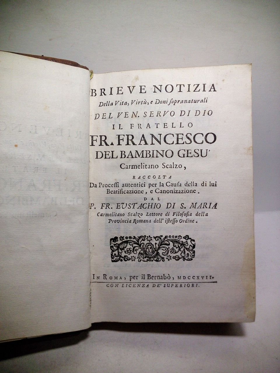 Brieve Notizia Della Vita, Virtù, e Doni sopranaturali del Ven. Servo di Dio il Fratello Fr. FRANCESCO DEL BAMBINO GESU, Carmelitano Scalzo / Raccolta Da Processi autentici pel la Causa della di lui Beatificazione, e Canonizazione. Dal P. Fr. Eustachio di S. Maria, Carmelitano Scalzo Lettore di Filosofia della Provincia Romana dell'istesso Ordine