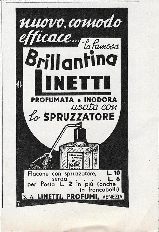 Brillantina Linetti con spruzzatore. Advertising 1942