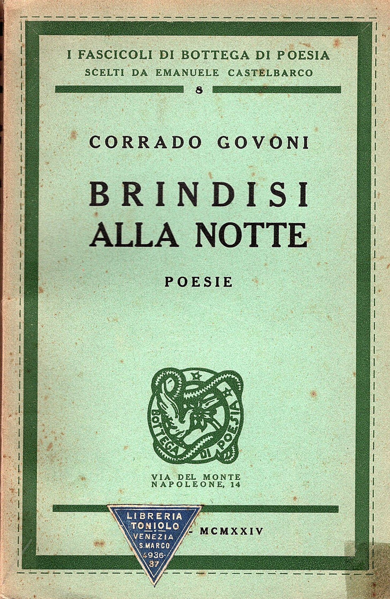 In-16° grande, pp. 152, (8). Brossura originale. Bell' esemplare, entro velina (traccia di nastro a un angolo della copertina). Prima edizione, tirata a complessivi 525 esemplari . I Fascicoli di Bottega di Poesia scelti da Emanuele Castelbarco, 8. Spaducci, p. 147. Gambetti / Vezzosi, p. 398.