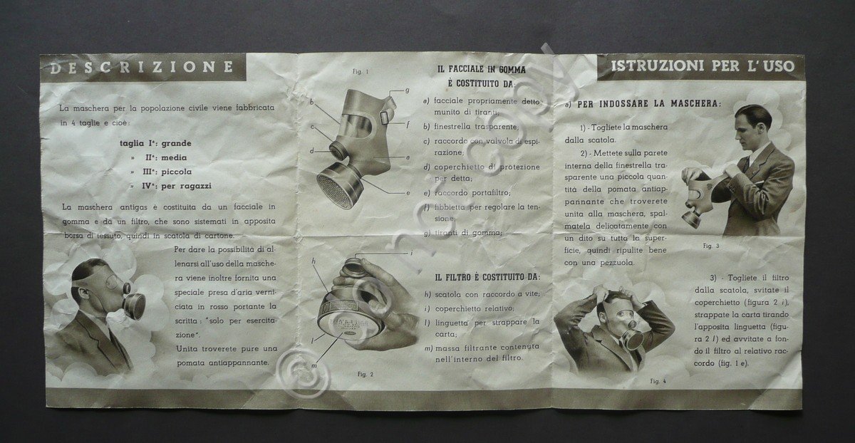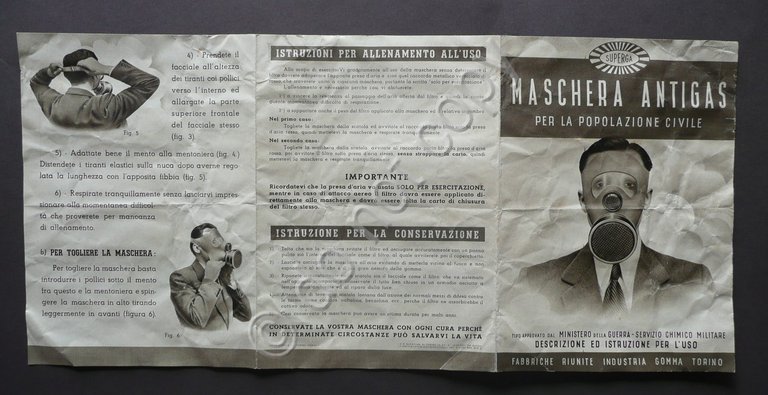 Brossura pubblicitaria, Superga Maschera antigas per la popolazione civile tipo approvato dal Ministero per la Guerra - Servizio Chimico Militare descrizione ed istruzione per l'uso Fabbriche Riunite Industria Gomma - Torino Gros Monti e C., Torino 1939, brossura pubblicitaria rip. pi√π volte con varie fig. nel testo. Cm 17,5x12,5 (chiusa), cm 17,5x37,5 (aperta). Condizioni di conservazione Esemplare in buone condizioni con tracce d'uso, leggera piega centrale di conservazione, alcune stropicciature. SC03.D9670 N