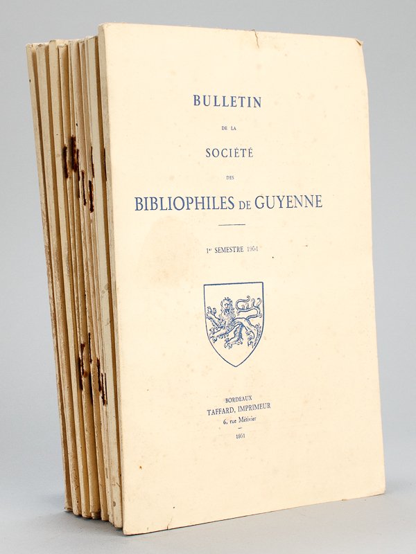 18 numéros in-8 br. ou agrafés, Taffard, Bordeaux, 1951-1960 : Bulletin de la Société des Bibliophiles de Guyenne [ Série continue de 18 livraisons, du 1er semestre 1951 au Second Semestre 1960 - Années 1951, 1952, 1953, 1954, 1955, 1956, 1957, 1958, 1959, 1960 Complètes ] 1951 : Semestres 1 et 2 - Complet ; 1952 : Semestres 1 et 2 - Complet ; 1953 : Semestres 1 et 2 - Complet ; 1954 : Semestres 1 et 2 - Complet ; 1955 : Semestres 1 et 2 - Complet ; 1956 : Semestres 1 et 2 - Complet ; 1957 : Janvier-Décembre - Complet ; 1958 : Semestres 1 et 2 - Complet ; 1959 : Janvier-Décembre 1959 - Complet ; 1960 : Semestres 1 et 2 - Complet Bon ensemble suivi réunissant 9 années du Bulletin de la Société des Bibliophiles de Guyenne (couverture de la dernière livraison tachée, petits accrocs et frott. sur qq. couv., bon état par ailleurs). Le premier numéro s'ouvre sur la description de la fameuse aventure de l'achat du Livre de Raison de Montaigne, par les soins de Pierre Bérès, pour la Bibliothèque Municipale de Bordeaux.