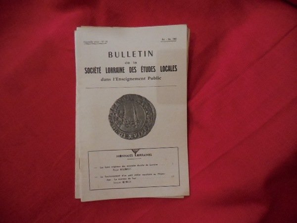 Nancy, Société d'Impression Typographiques, 1961; in-8, 24 pp., couverture et cahier agrafés. Sommaire : Monnaies lorraines : Les Types originaux des monnaies ducales de Lorraine, par Roger BILLORET, p. 1 ; Le Fonctionnement d'un petit atelier monétaire au Moyen-Âge : la monnaie de Toul, par Jacques CHOUX, p. 17.