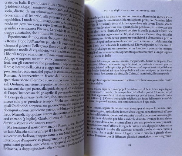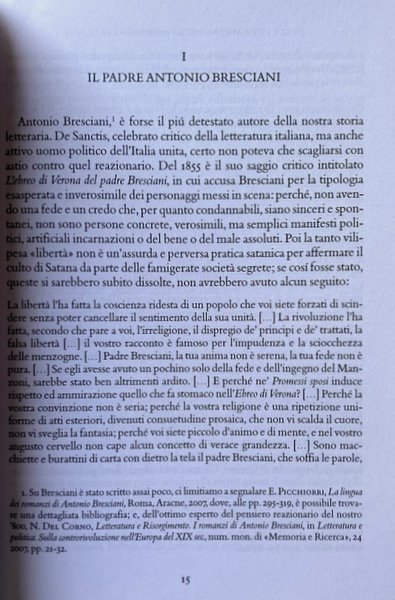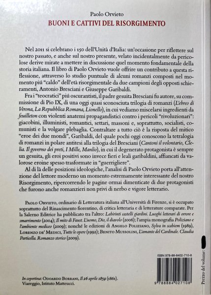 Soggetti: Letteratura italiana, Critica letteraria, Ottocento, Novecento, Saggi, Storia contemporanea, Romanzo storico, Romanzi storici, Risorgimento, Unità, Antonio Bresciani, Scrittori risorgimentali, Narrativa, Ideologie politiche, Papa Pio IX, Rivoluzione francese, Giacobini, Massoni, Socialisti, Cospiratori, Cospirazioni, Società segrete, Logge massoniche, Carboneria, Moti rivoluzionari, Conservatorismo, Borghesia, Mentalità, Successi editoriali, Pubblico, Lettori, Eroismo, Unificazione, Trilogie, Epopea, Avventura, Azione, Racconti di guerra, Guerre di indipendenza, Battaglie, Sconfitte, Liberazione, Personaggi letterari, Donne, Anita Garibaldi, Cristina di Belgioioso, Reazionari, Calunnia, Satira, Carlo Maria Curci, Anatemi, Papalini, Fazioni, Scuole di pensiero, Romanticismo, Illuminismo, Polemiche letterarie, Gauchos, Nizzardo, Guerriglieri, Satanismo, Blasfemia, Martiri, Patrioti, Aguyar, Legittimisti, Intellettuali, Monaldo Leopardi, Topos, Luoghi comuni, Miti, Leggende, Mitologia, Iconografia, Morale, Stampa, Editoria, Pubblicazioni, Feuilletons, Idee, Propaganda, Misteri di Parigi, Eugène Sue, Guerrazzi, Massimo D'Azeglio, Alessandro Manzoni, Cantù, Grossi, Cronache, Romanzo popolare, De Sanctis, Analisi, Cinque Giornate di Milano, Margareth Fuller, Jessie White Mario, Giannina Milli, Giulia Molino Colombini, Ebreo di Verona, Padre Bresciani, Cavour, Dumas, Uruguay, Sud America, Imprese, Giuseppe Guerzoni, Manlio, Lionello, Satana, Ciceruacchio, Babette, Young Eduard, Voltaire, Callimaco Zambianchi, Savoia, Vittorio Emanuele, Regno, Piemonte, Talarico Giosafatte, Trivulzio, Saint-Simon, Madame de Stael, Oudinot, Napoleone, Murat, Repubblica Partenopea, Romana, Rossetti, Rousseau, Cultura francese, Ricasoli, Rattazzi, Radetzky, Silvio Pellico, Vincenzo Gioberti, Clelia, Goffredo Mameli, Inno, Asburgo, Austria, Hugo, Borbone, Cantoni, Byron, Diaz, Foscolo, Moringue, Berchet, Napoli, Libertà, Libri Vintage Fuori catalogo, Storiografia, Revisionismo, Georgina Saffi, Clara Maffei, Italian literature, Literary criticism, Nineteenth century, Twentieth century, Essays, Contemporary history, Historical novels, Risorgimento, Unity, Writers, Fiction, Political ideologies, Pope Pius IX, French Revolution, Jacobins, Freemasons, Socialists, Conspirators, Conspiracies, Secret societies, Masonic Lodges, Carboneria, Revolutionary motions, Conservatism, Bourgeoisie, Mentality, Editorial successes, Audience, Readers, Heroism, Unification, Trilogies, Epic, Adventure, Action, War tales, Wars of independence, Battles, Defeats, Liberation, Literary characters, Women, Reactionaries, Slander, Satire, Anathemas, Factions, Schools of thought, Romanticism, Enlightenment, Literary controversy, Nice, Guerrillas, Satanism, Blasphemy, Martyrs, Patriots, Legitimists, Intellectuals, Commonplaces, Myths, Legends, Mythology, Iconography, Morals, Press, Publishing, Publications, Ideas, Mysteries of Paris, Chronicles, Popular fiction, Analysis, Five Days of Milan, Jews, South America, Companies, Satan, Savoy, Kingdom, Piedmont, Neapolitan Republic, Roman, Culture, Hymn, Habsburg, Bourbon, Naples, Freedom, Out of print books, Historiography, Revisionism