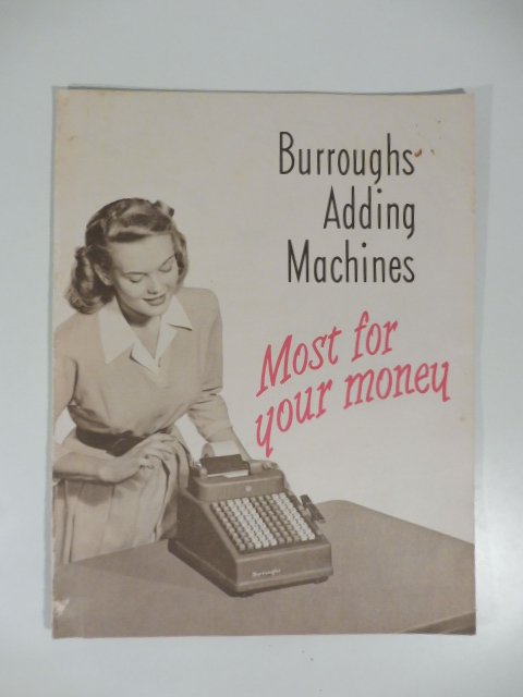 Pieghevole di 10 facciate (ciascuna misura cm 21 x 27) con illustrazioni. Alone nella parte superiore dell'ultima facciata dovuto a graffetta metallica. Pieghevole pubblicitario di alcuni modelli di calcolatore Burroughs. Non datato ma ascrivibile al 1945-50.