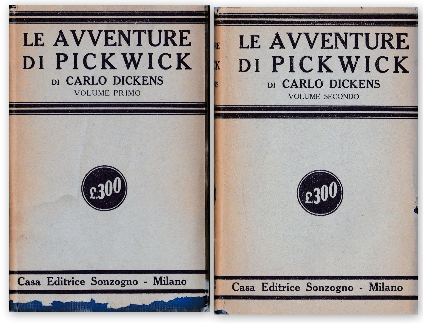 C. DICKENS-LE AVVENTURE DI PICK WICK VOL. E II-SONZOGNO 1954-L4241 "2 VOLUMI: SOVRACOPERTA EDITORIALE CON MARGINE INFERIORE ROVINATO DEL PRIMO VOLUME, DORSO OSSIDATO, COPERTINA SEMIRIGIDA IN SIMILPELLE AZZURRA CON TITOLI IN NERO AL PIATTO E AL DORSO, MARGINE INFERIORE CON PICCOLE PIEGHE, FOGLI DI GUARDIA ILLUSTRATI, LEGATURA A VISTA NEL PRIMO VOLUME, AL FRONTESPIZIO DEL PRIMO VOLUME TIMBRO IN ROSSO CON MOTTO, TAGLI SUPERIORI IMPOLVERATI, INTERNO IN BUONO STATO N. PAG. 444+444 CM. 18 X 12"