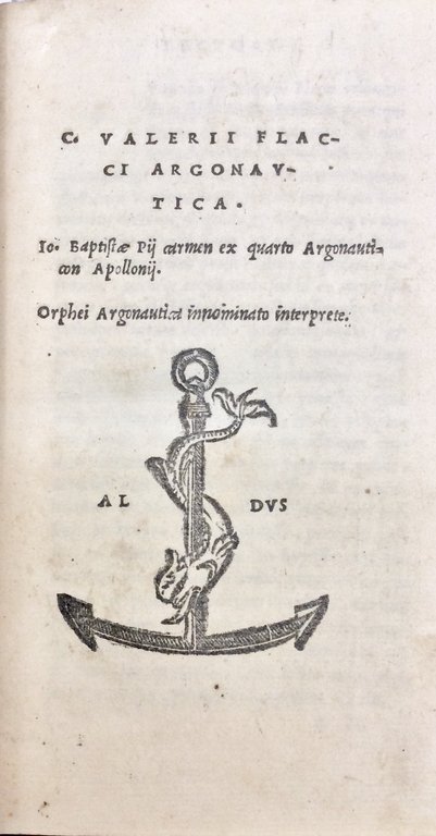 In-16 p. (mm. 150x85), legatura antica in mz. vitellino, fregi e titolo oro su dorso a cordoni, tagli marmorizzati, 146 cc.num., 2 cc.nn. (registro, sottoscrizione e ancora aldina al verso della carta bianca). Al frontespizio ancora aldina. Testo in carattere corsivo e romano, spazi per capilettera con letterine guida. "Prima e unica edizione aldina" della trattazione di Valerio Flacco del famoso mito greco di Giasone e dei suoi uomini, gli Argonauti, tradizionalmente attribuito al mitico poeta tracio Orfeo. Le Argonautiche rappresentano l'unica opera conosciuta del poeta di età flavia, Valerio Flacco.Caio Valerio Flacco (I sec. d.C.) prese "Le Argonautiche" a modello del suo omonimo poema epico sulla spedizione degli Argonauti scritto verso il 70, dedicato all'Imperatore Vespasiano. Le "Argonautiche" di Valerio Flacco si arrestano al verso 467 dell'ottavo libro e quindi mancano: l'uccisione di Absirio, il ritorno degli Argonauti, il tradimento di Giasone. Come il modello greco il pema latino è di stile omerico, freddo e artificioso, ma non privo di veri pregi descrittivi e patetici. Dei quattro libri di Apollonio, Valerio Flacco, liberamente abbreviandone le parti, seguì la traccia. C'è nel romano più unità logica di disegno e maggior rilievo dei caratteri. Valerio Flacco è il vero discepolo dei grandi elegiaci romani. (così Diz. opere Bompiani,I, pp. 242-243). Cfr. anche Renouard 97/3 - Adams V-77 - Brunet,V,1045. Nel ns. esemplare le cc. 83 e 85 sono state posposte; rifilato al margine superiore, ma certamente un bell'esemplare, completo.