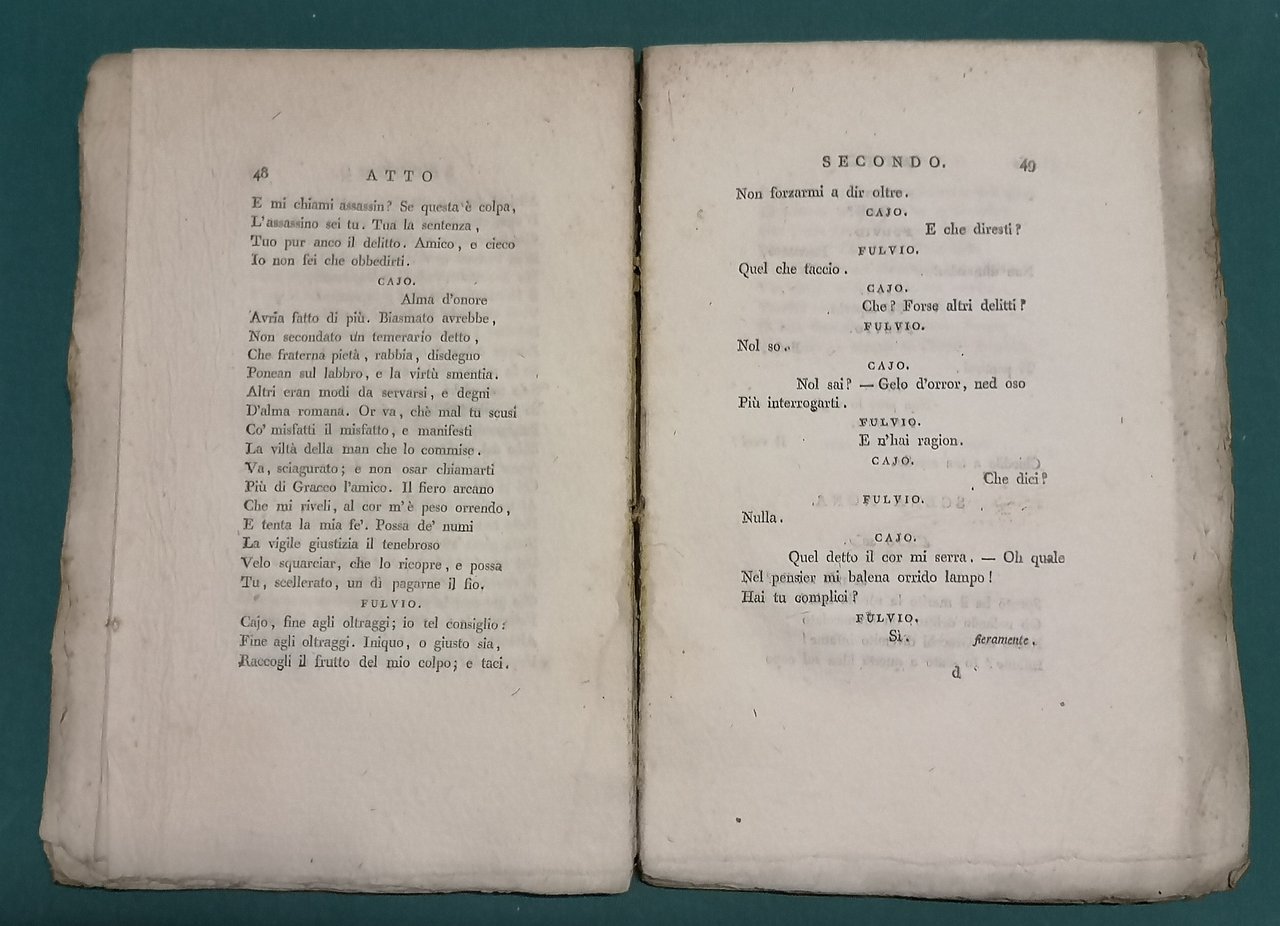>in-8, pp. (4), 111, leg. coeva in carta decorata (dorso rotto). Terza presunta edizione della tragedia in cinque atti di V. Monti (1754-1828), scritta tra 1788 e 1800, in cui l'autore mise in scena il suo ideale politico, contrario alla demagogia e alla tirannide. Fonte d'ispirazione per quest'opera furono il ''Coriolano'' e il ''Giulio Cesare'' di Shakesperare, le ''Notti Romane'' del Verri e autori classici come Plutarco e Cicerone. Edizione elegantemente impressa su carta forte a fogli diseguali. Esemplare assai fresco e a fogli chiusi (ma legatura debole). Bustico, 126. Salvioli, 595. Renda-Operti, pp. 768-775.