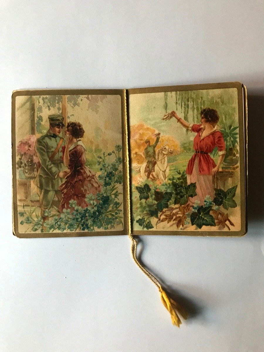 Calendarietto da barbiere, Calendarietto profumato Partenze e Ritorni,Ai Colli Fioriti." Milano 1918 CART.0698 blu graf.Leopoldo Baroni Milano 1918; 7x9 cm; pp. 4 nn. Brossura ed. ill. a colori. Immagini cromolitografiche all'interno, calendario.Con nastrino di legatura colorato,Pubblicità all'interno,con copertina con stampa a rilievo. Condizioni di conservazione Calendario in ottimo stato di conservazione con minimi segni del tempo,specialmente nel dorso. Ricercato calendarietto con copertina con stampa a rilievo,e immagini a colori. CART.0698 blu "