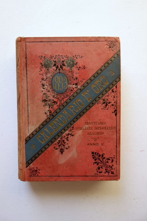 Calendario d'Oro prontuario nobiliare diplomatico araldico storico statistico anno V - 1893 Stab. A. Staderini, Roma 1893; cm 23,5x16; pp. 244-464-88, con 5 stemmi araldici litografici su cartoncino fuori t., 4 a colori e 1 in b/n; un ritratto inc. in b/n fuori t. del Principe Vittorio Emanuele Conte di Torino. Legatura d'epoca in tutta tela rossa con titolo impresso in oro, bei fregi impressi in nero e a vari colori ai piatti e al dorso. Condizioni di conservazione Esemplare complessivamente in buono stato con tracce d'uso; coperta con alcuni leggeri aloni e tracce di sporco, minime macchiette; dorso lievemente ingiallito; piccole sgualciture agli angoli dei piatti e alle cuffie. Interni lievemente ingialliti a causa dell'età, con minimo foxing; pp. 327-330, compresa una tavola cromolitografica, staccati dal corpo del testo; esemplare peraltro compatto. Con cinque stemmi araldici litografici fuori testo, quattro a colori e uno in bianco e nero. Le tavole raffigurano i blasoni delle seguenti famiglie: De Peon y De Regil; De Montalbo di S. Marino; De Nobili-Alabro; Contuzzi Suppa-Pagano (in bianco e nero); Garofalo di Bonito e di Camella. SETT222.L21471 N