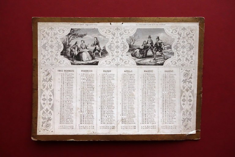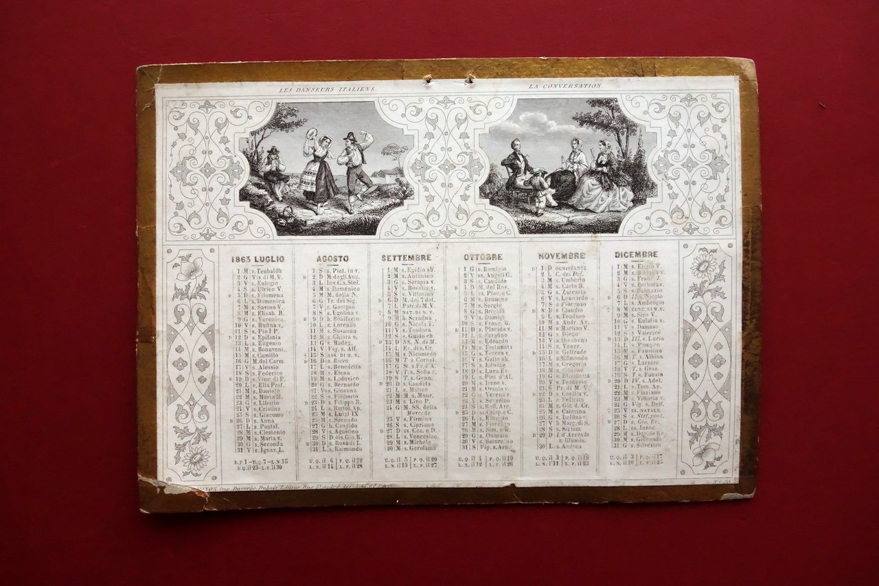 Calendario da parete, Calendario da parete 1863 applicato su cartoncino di supporto con belle illustrazioni in bianco e nero mensilità in italiano, didascalie descrittive delle figure in francese Duveroè - Dubois, Paris 1863; bel calendario da parete ottocentesco applicato su supporto in cartoncino; mensilità a entrambi i lati, con belle figure in b/n al margine superiore di ciascun lato (vedi foto). Al margine superiore due piccoli forellini per fissaggio a parete. Cm 16x22,5. Condizioni di conservazione Complessivamente in buone condizioni con leggeri segni del tempo, lievemente ondulato; supporto in cartoncino leggermente sgualcito ai margini e con tracce di pieghette e tre angoli. Calendario con alcuni piccoli lievi aloni e qualche minima leggerissima abrasione. Per ulteriori dettagli vedi foto. SC03.D18929 N