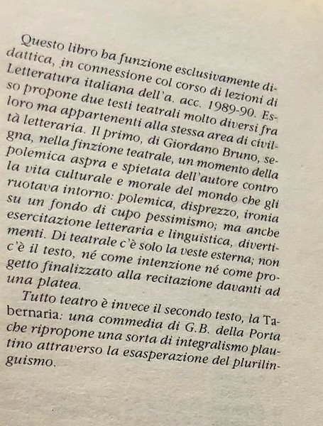 Questo libro ha funzione esclusivamente didattica, in connessione col corso di lezioni di Letteratura italiana dell'anno accademico 1989-90. Esso propone due testi teatrali molto diversi fra loro ma appartenenti alla stessa area di civiltà letteraria. Il primo, di Giordano Bruno, segna, nella finzione teatrale, un momento della polemica aspra e spietata dell'autore contro la vita culturale e morale del mondo che gli ruotava intorno: polemica, disprezzo, ironia su un fondo di cupo pessimismo; ma anche esercitazione letteraria e linguistica, divertimenti. Di teatrale c'è solo la veste esterna; non c'è il testo, né come intenzione né come progetto finalizzato alla recitazione davanti ad una platea. Tutto teatro è invece il secondo testo, la Tabernaria: una commedia di G.B. della Porta che ripropone una sorta di integralismo plautino attraverso la esasperazione del plurilinguismo.