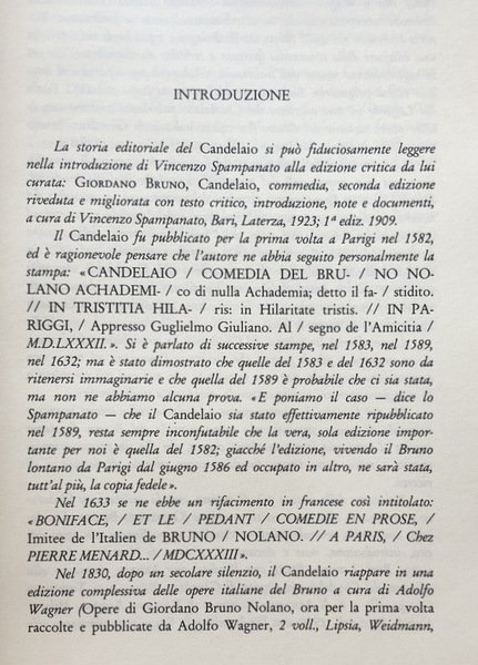La storia editoriale del Candelaio si può fiduciosamente leggere nella introduzione di Vincenzo Spampanato alla edizione critica da lui curata: GIORDANO BRUNO, Candelaio, commedia, seconda edizione riveduta e migliorata con testo critico, introduzione, note e documenti, a cura di Vincenzo Spampanato, Bari, Laterza, 1923; 1ª ediz. 1909.