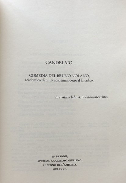 Il Candelaio fu pubblicato per la prima volta a Parigi nel 1582, ed è ragionevole pensare che l'autore ne abbia seguito personalmente la stampa: «CANDELAIO COMEDIA DEL BRUNO NOLANO ACHADEMICO di nulla Achademia; detto il fastidito. // IN TRISTITIA HILA- ris: in Hilaritate tristis. // IN PA RIGGI,/ Appresso Guglielmo Giuliano. Al segno de l'Amicitia / M.D.LXXXII.». Si è parlato di successive stampe, nel 1583, nel 1589, nel 1632; ma è stato dimostrato che quelle del 1583 e del 1632 sono da ritenersi immaginarie e che quella del 1589 è probabile che ci sia stata, ma non ne abbiamo alcuna prova. E poniamo il caso dice lo Spampanato che il Candelaio sia stato effettivamente ripubblicato - nel 1589, resta sempre inconfutabile che la vera, sola edizione impor tante per noi è quella del 1582; giacché l'edizione, vivendo il Bruno lontano da Parigi dal giugno 1586 ed occupato in altro, ne sarà stata, tutt'al più, la copia fedele».
