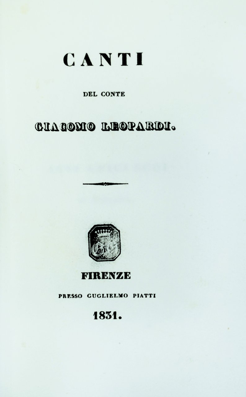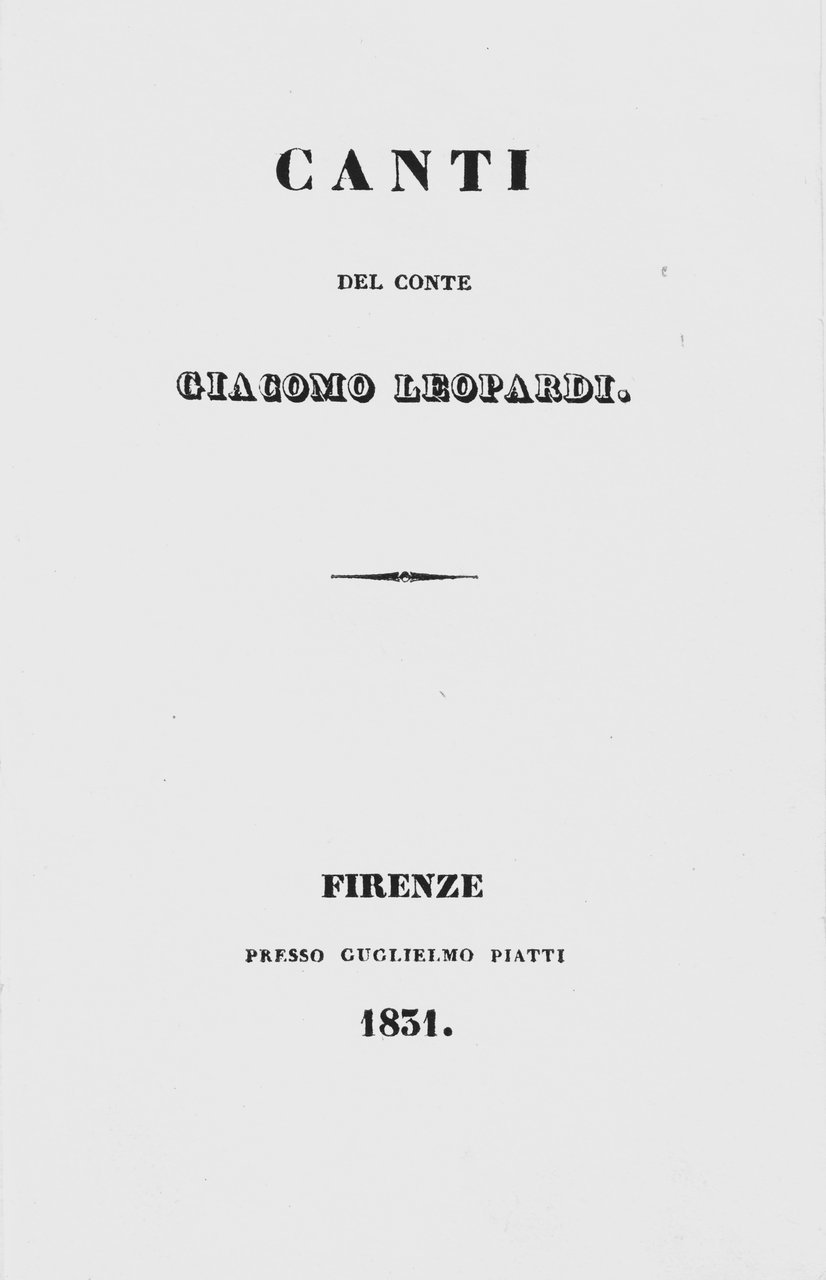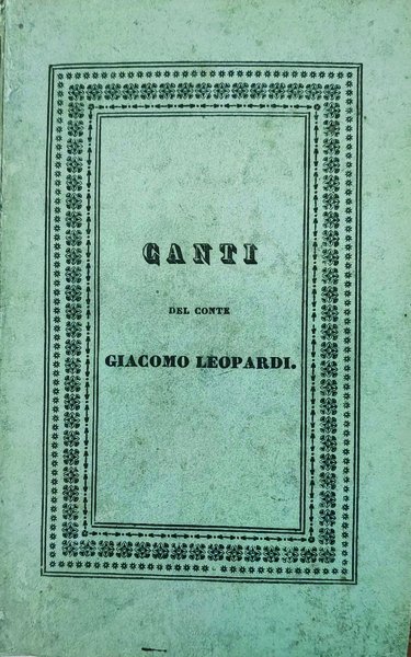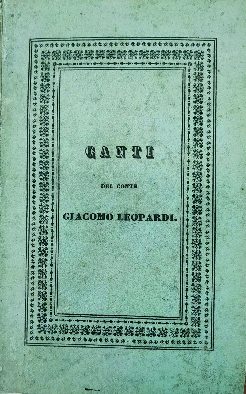 In-24 gr. (mm. 143x89), piena pergamena coeva, filetti e titolo oro su tassello al dorso, 1 c. bianca, 165 pp., 1 p. bianca. Vi sono raccolti 23 Canti di cui gli ultimi 6 in prima edizione: Il risorgimento - A Silvia - Le ricordanze - Canto notturno dun pastore vagante dellAsia - La quiete dopo la tempesta - Il sabato del villaggio. Introduce i "Canti" la bellissima lettera dedicatoria "Agli amici suoi di Toscana", stampata qui per la prima volta. Rara e ricercata "edizione originale".Cfr. Mazzatinti e Menghini Bibliografia leopardiana, I, 670 - Parenti Prime edizioni italiane, p. 308.Restauro allangolo superiore del frontespizio; rare e lievissime fioriture intercalate nel testo, ma certamente bellesemplare, ben conservato.