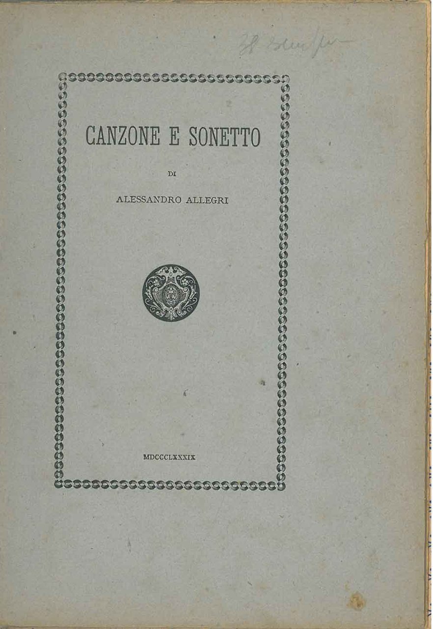 21 cm, rilegatura coeva in cartoncino ricoperto, conserva le cop. originali; p. 14, (2), edizione di 38 esemplari numerati, il nostro n. 27, il sonetto licenzioso è pubblicato per la prima volta