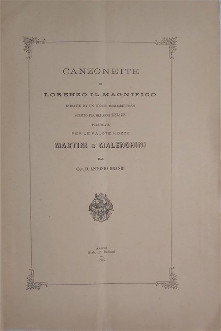CANZONETTE di Lorenzo il Magnifico estratte da un Codice Magliabechiano scritto fra gli anni 1483-1488, pubblicate per le fauste nozze Martini e Malenchini.