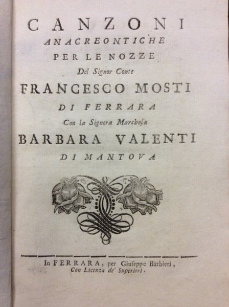 CANZONI ANACREONTICHE PER LE NOZZE DEL SIGNOR CONTE FRANCESCO MOSTI DI FERRARA CON LA SIGNORA MARCHESA BARBARA VALENTI DI MANTOVA.