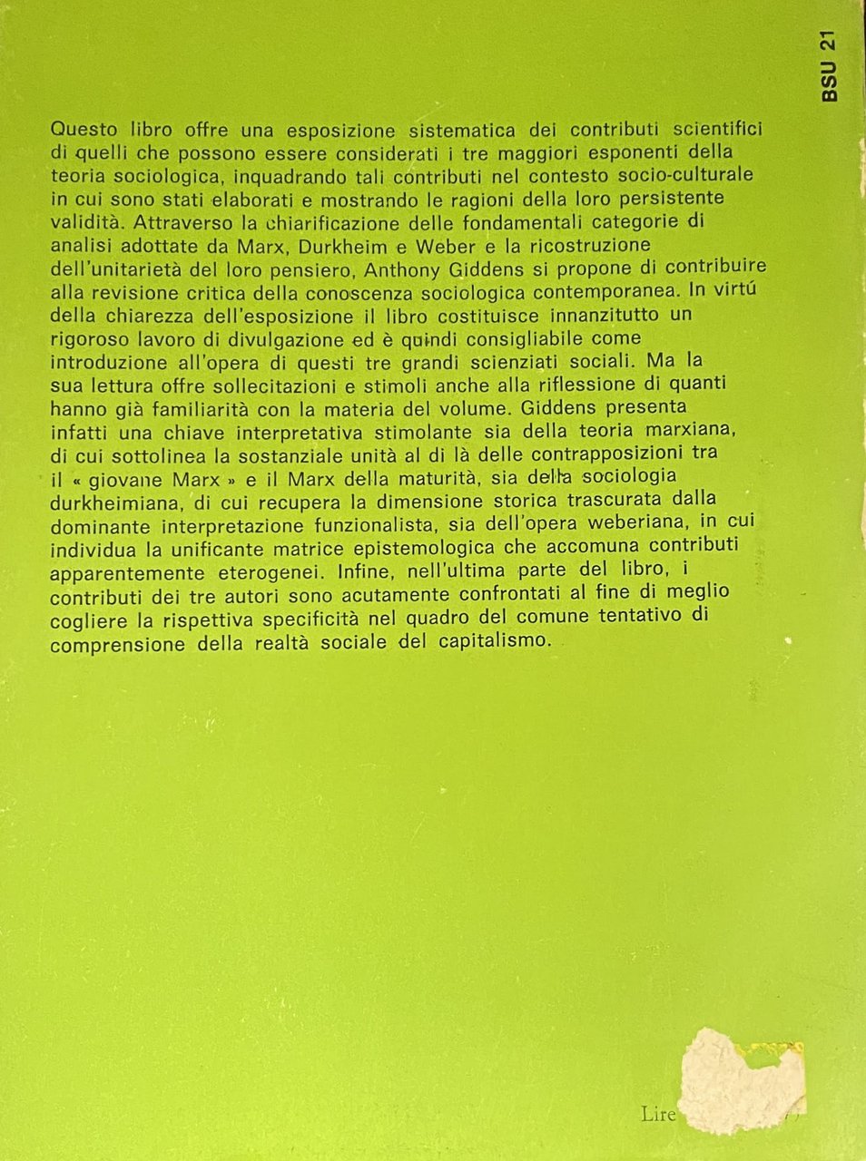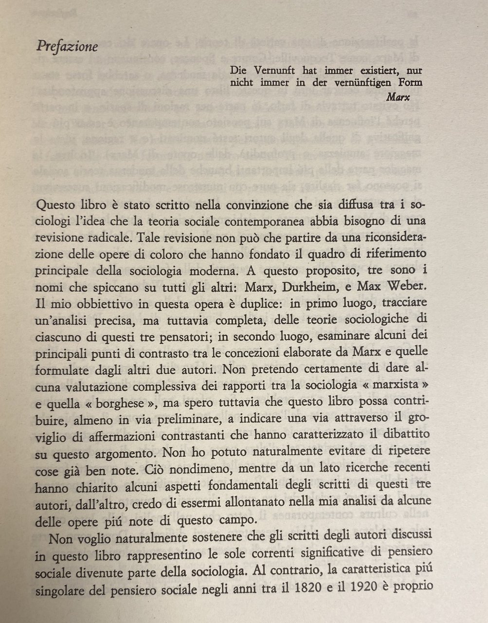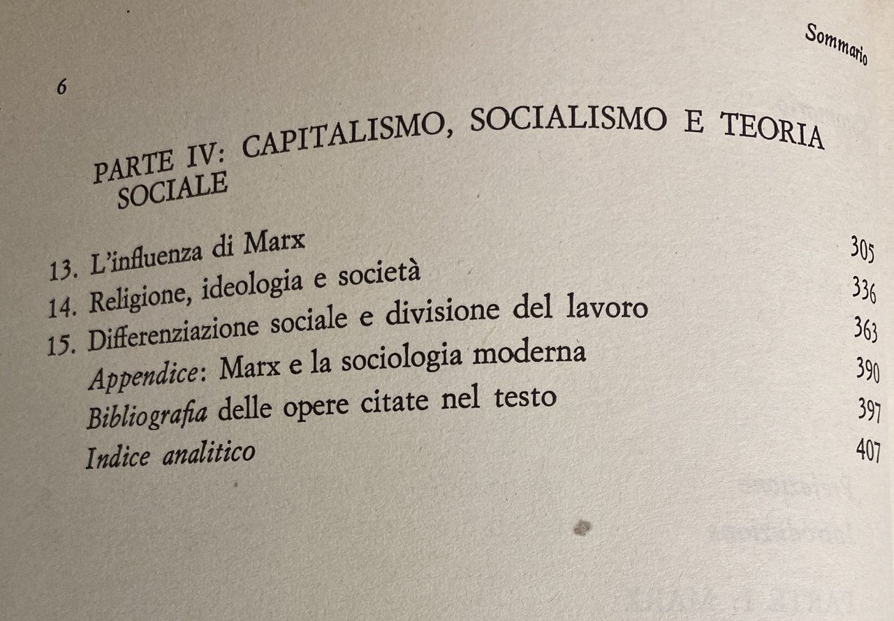 Soggetti: Teorie sociologiche, Sociologia, Politologia, Scienze sociali, Capitalismo industriale Società Analisi Karl Marx Émile Durkheim Max Weber Saggi Categorie Pensiero Ortodossia Critica Interpretazione Spirito Religione Magia Modernità Classe Anomia Teoria marxiana Giovane Funzionalismo Comparata Scritti Burocrazia Comunità Condizioni Economia Divisione del lavoro Empirico Engels Feudalesimo Feuerbach Filosofia Germania Hegel Hegeliana Ideali Interessi Ideologia Tedesca LRMS Marxista Materiale Mercato Plusvalore Politica Prodotti Profitto Protestantesimo Rivoluzione Schäffle Sistema Borghese Borghesia Specializzazione Suicidio Sviluppo Totem Tradizionale Materialismo storico Rapporti di produzione Struttura Metodo sociologico Individualismo Socialismo Gruppi professionali Morale Concetti fondamentali Razionalizzazione Grandi religioni Differenziazione Studi culturali Relazioni pure Grundrisse Kritik Inghilterra Francia Europa Accumulazione Capitale Alienazione Bruno Bauer Antiduhring Raymond Aron Opere giovanili Bibliografia Riferimento Libri fuori catalogo Merce Dominio Lotta Sfruttamento Cattolicesimo Ebraismo Islam Calvinismo Protestantesimo Etica Vocazione professionale Beruf Georg Simmel Sozialpolitik Schmoller Dahrendorf Coscienza Culto Rituali Dobb Dreyfus Democrazia Darwin Kant Gurvitch Kautsky Knies Freund Fromm Imperialismo Lichtheim Libertà Leggi Arturo Labriola Antonio Gramsci Lukacs Rosa Luxemburg Lutero Comunismo Proletariato Mana Marcuse Talcott Parsons Mommsen Michels Runciman Russia Rousseau Sacra Famiglia Saint-Simon Schumpeter Cina Confucianesimo Utilitarismo Sovrastruttura Totemismo Tonnies Tesi Sweezy Stirner Strauss Legittimità Potere Diritto Althusser Birnbaum Duvignaud Davy Mauss Nisbet Gunther Roth Winckelmann Classici Sociological theories Sociology Politology Social sciences Industrial capitalism Society Analysis Essays Categories Thought Orthodoxy Criticism Interpretation Spirit Religion Magic Modernity Class Anomie Marxian theory Young Comparative Functionalism Writings Bureaucracy Community Conditions Economy Division of labor Empirical Feudalism Philosophy Germany Ideals Interests German Ideology Material Market Surplus value Politics Products Profit Protestantism Revolution Bourgeois System Bourgeoisie Specialization Suicide Development Traditional Historical materialism Production relations Structure Sociological method Individualism Socialism Professional groups Morality Fundamental concepts Rationalization Major religions Differentiation Cultural studies Pure relations England France Europe Accumulation Capital Alienation Early works Bibliography Reference Out of print books Commodity Domination Struggle Exploitation Catholicism Judaism Islam Calvinism Protestantism Ethics Professional vocation Conscience Cult Rituals Democracy Imperialism Freedom Laws Luther Communism Proletariat Holy Family China Confucianism Utilitarianism Superstructure Thesis Legitimacy Power Law Classics
