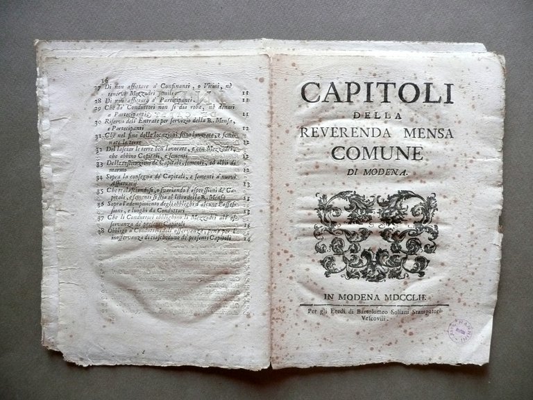 Capitoli della Reverenda Mensa Comune di Modena Bartolomeo Soliani 1752