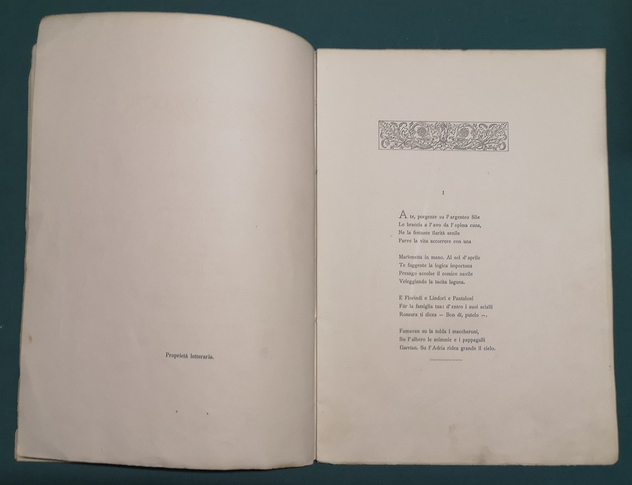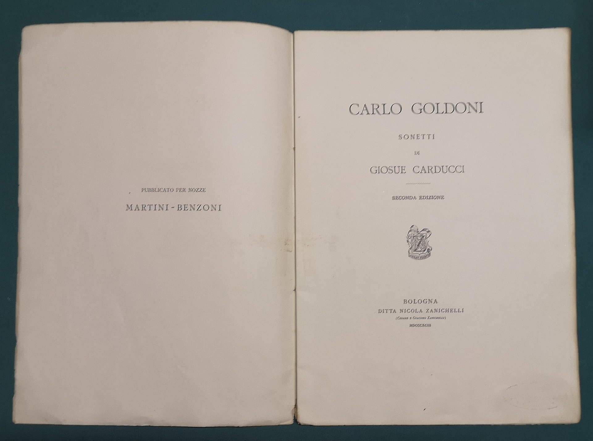 >in-4, pp. (7), broch. edit. Pubblicazione per nozze Martini-Benzoni, dei quattro sonetti dedicati da Carducci a Goldoni. Edizione curata, come tutte le più grandi opere del poeta, dalla tipogr. bolognese Zanichelli. Bell'esempl., su carta forte. Salveraglio, Bibliogr. Carducciana, n.180.
