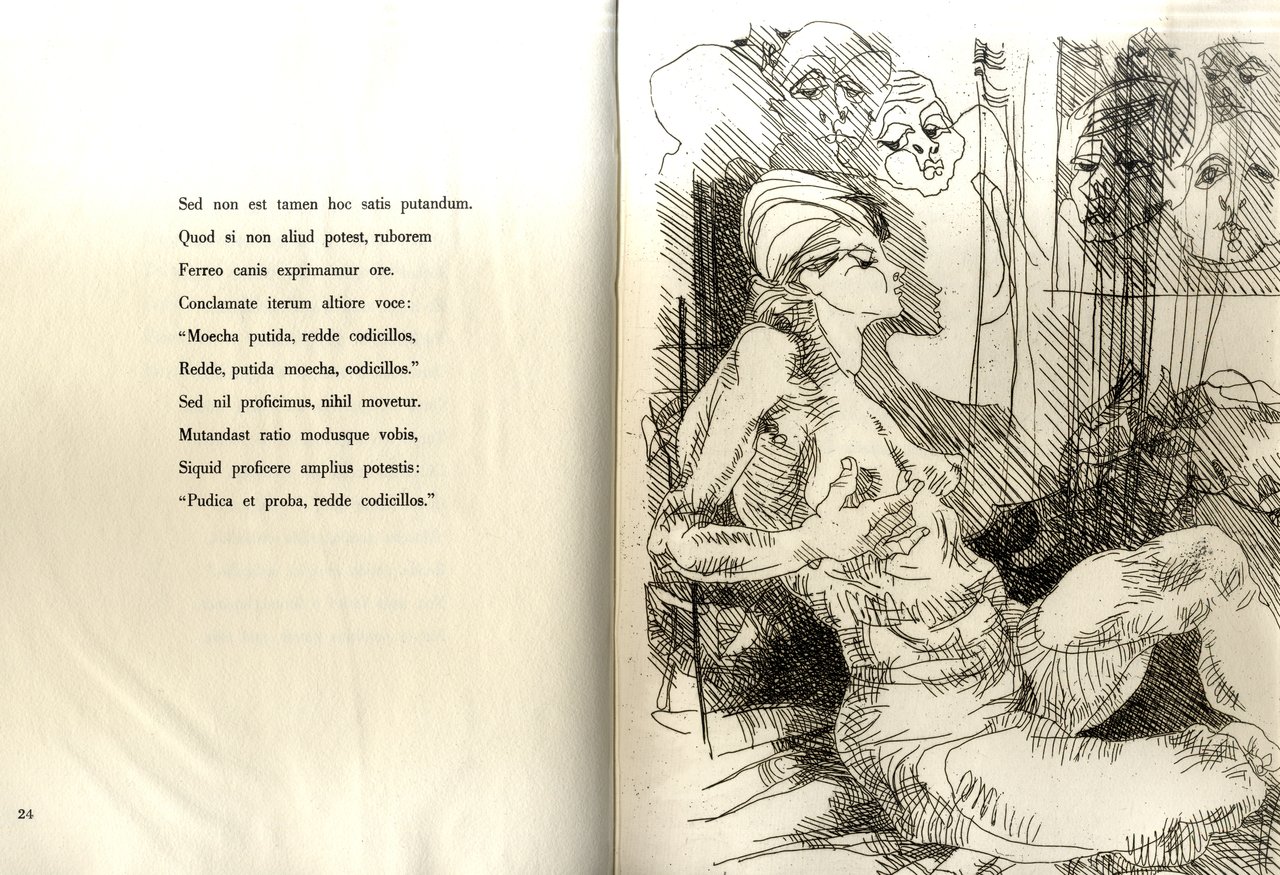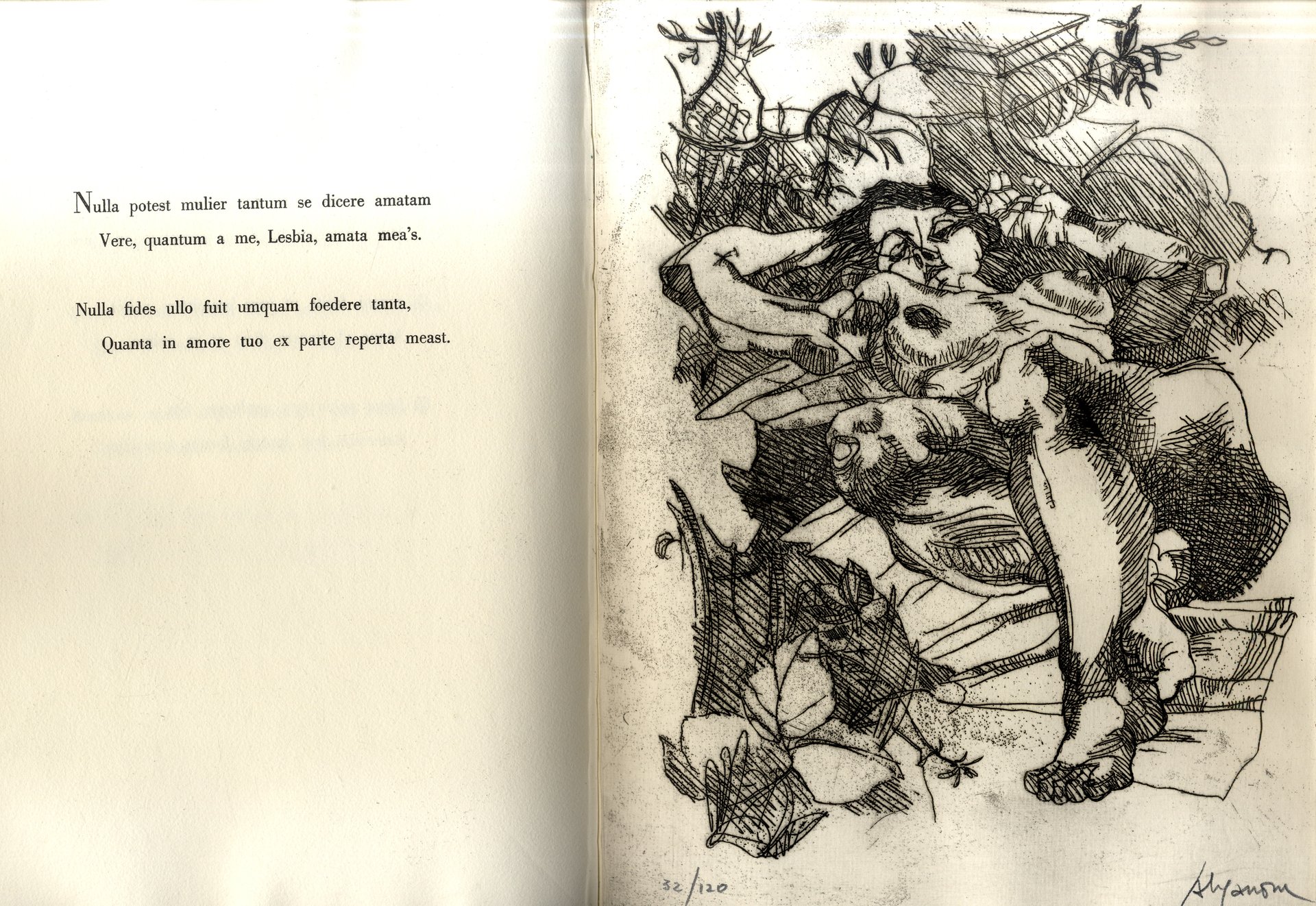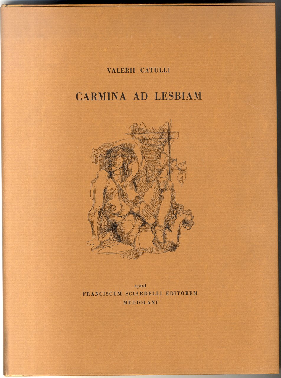 >in-4, pp. 51, (4); legatura tipo “francese” e astuccio cartonato, interamente realizzati su carta appositamente fabbricata dalla cartiera Ventura di Cernobbio. Con il testo di Catullo in latino e 5 acqueforti a piena pag. di A. Viganone, firmate e numerate dall'artista; testo composto e stampato a mano nell'officina grafica “Esperia” di Milano. Acqueforti stampate su torchio a mano da F. Sciardelli. I rami, a tiratura ultimata, sono stati biffati. Impresso su carta a tino della cartiera Magnani di Pescia. Tiratura di 120 esempl. (n. 32). Perfetto esemplare. Jentsch, 609, p. 358.