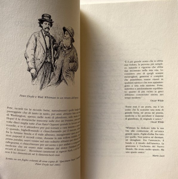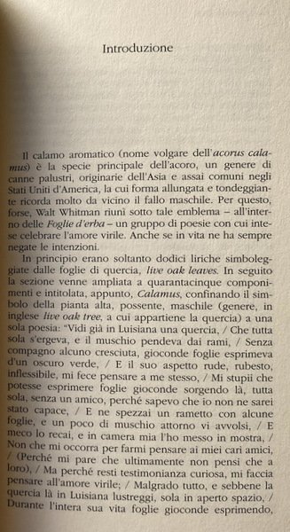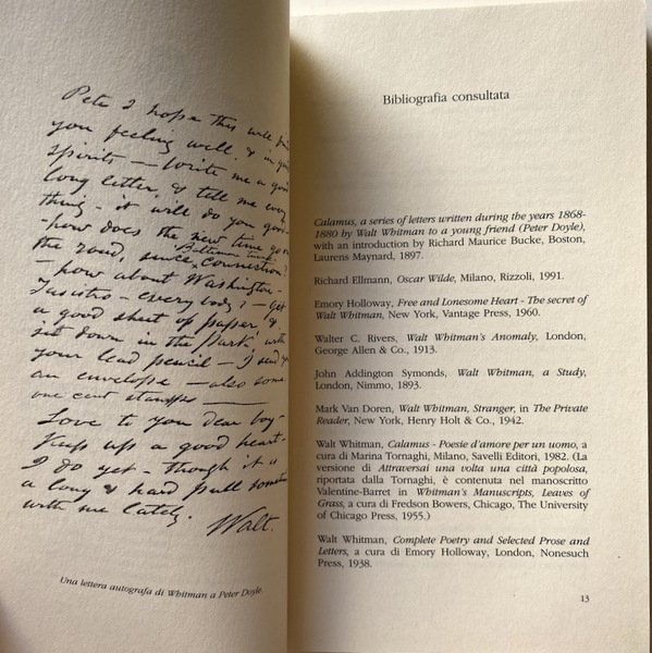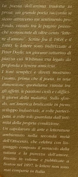 Soggetti: Poesia, Ottocento, Lettere d'amore, Corrispondenza, Epistolario, Poetica, Poeti americani, Raccolte poetiche, Biografie, Diario, Memorie, Omosessualità, Letteratura americana, Peter Doyle, Libri Vintage, Fuori catalogo, Bibliografia, Amore, Passioni giovanili, America, Stati Uniti, Boom industriale, Cronologia, Vita, Dediche, Frammenti, Componimenti, Poemi, Amanti, Working-class Camerados, Classe operaia, Appunti, Note, Leaves of Grass, Guerra di secessione, Calamo aromatico, Acarus calamus, Acaro, Canne palustri, Foglie d'erba, Amore virile, Manoscritti, Prosa, Camden, Brooklyn, Viaggio, Poetry, 19th century, Love letters, Correspondence, Letters, Poetics, American poets, Poetic collections, Biographies, Diary, Memoirs, Homosexuality, American literature, Books not in catalog, Bibliography, Love, Youthful passions, United States, Chronology, Life, Dedications, Fragments, Compositions, Poems, Lovers, Notes, War of secession, Mite, Reeds, Manly love, Manuscripts, Prose, Travel, Live oak tree
