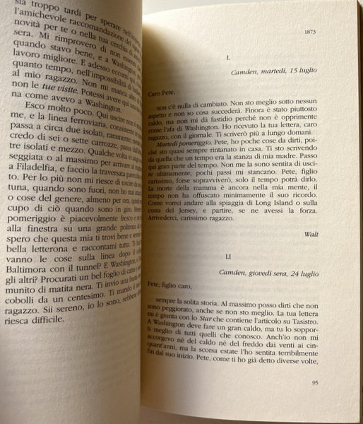 Queste lettere ci permettono di conoscere uno Whitman privato, straordinariamente tenero, un uomo amato e ben voluto dalle persone che avevano modo di incontrarlo. Non solo letterati, politici o intellettuali, ma anche semplici conducenti di tram, guidatori di battello, di cui ricorda affettuosamente nomi e numero di linee. Whitman appare sempre a suo agio tra la gente, totalmente innamorato del mondo che lo circonda, del suo paese, di New York come di Brooklyn, dei paesaggi di cui gode a bordo delle vetture su cui viaggia. E di cui spesso racconta liricamente al suo Pete, non un semplice vetturino ma il suo caro ragazzo, il suo giovane amoroso fratello, suo figlio. Si rimane colpiti di fronte alla tenerezza mostrata dal grande poeta americano, capace di tradurre in poche, ma efficaci, parole il grande affetto, non solo sensuale, che li univa. Racconti di un sentimento duraturo inframmezzati da dettagli particolareggiati sul pranzo del giorno, sul tempo trascorso sui battelli, dalle descrizioni dell’ambiente che circonda la sua casa sotto diverse condizioni climatiche, dai resoconti del suo stato di salute. Whitman è legato fortemente a Doyle, che rappresenta per lui non solo una fonte di conforto, anche durante gli spasmi cerebrali che lo attanagliarono in seguito, ma un pensiero frequente, una presenza costante nella sua mente.